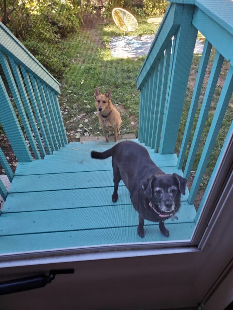 The backyard is a lot smaller than in Phoenix or Irondequoit. But it’s okay. We just run around and around it to get our exercise! And it has interesting smells all the same – lots and lots and lots of squirrels! And birds, all kinds of birds. And rabbits! And sometimes even other creatures who dig holes. Our neighbor had an encounter with a raccoon which Mom hopes we don’t ever have. But when we go walking sometimes, we can see a deer far off!