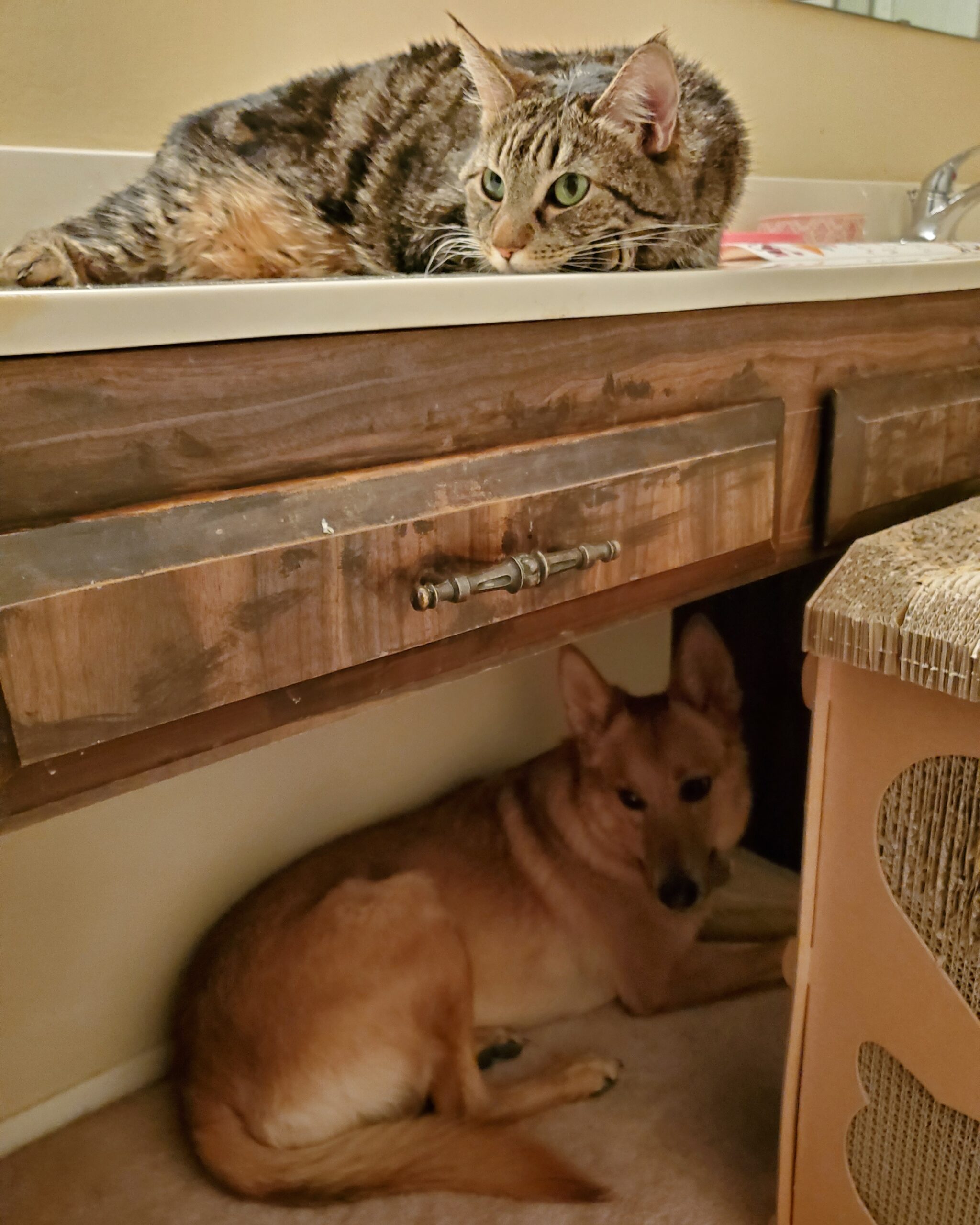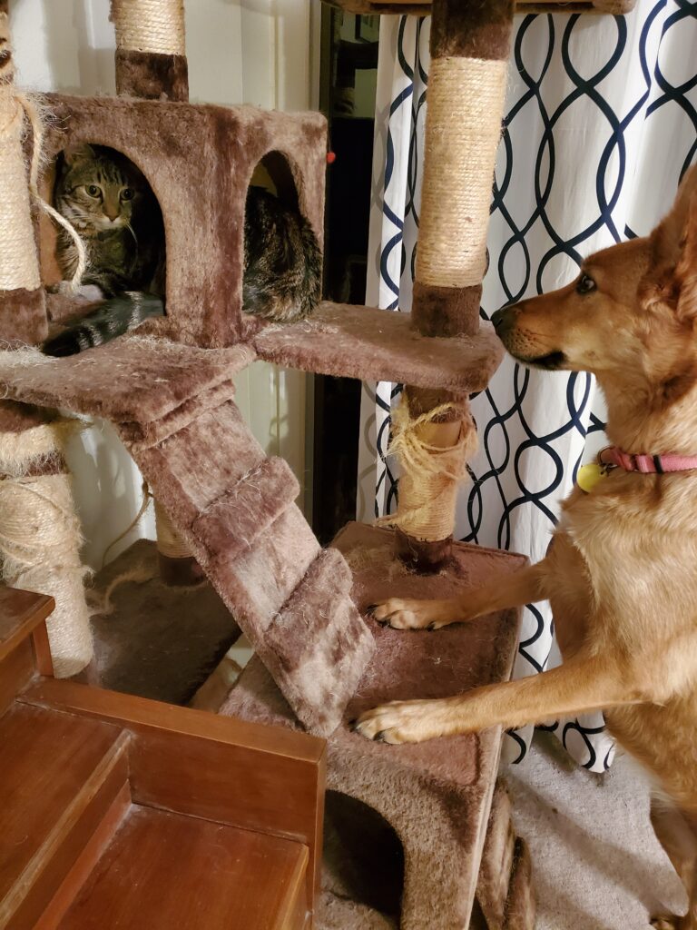 Eventually, Irina and I both realized that Mom was true to her word and loved us all. No one was getting left out. It look Katusha a little while longer than me to make friends with Irina, but eventually she did. Really, it happened during the pandemic, when Mom was home all day and spent all day with us. She separated Kat and Irina forever, but one day, Kat walked right out of the bedroom and climbed up her cat tree right in front of Irina and sat on the top rung. Irina sat down below and gazed up at her like she was the most gifted creature in the world to be able to climb up that tree.