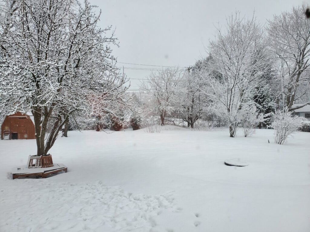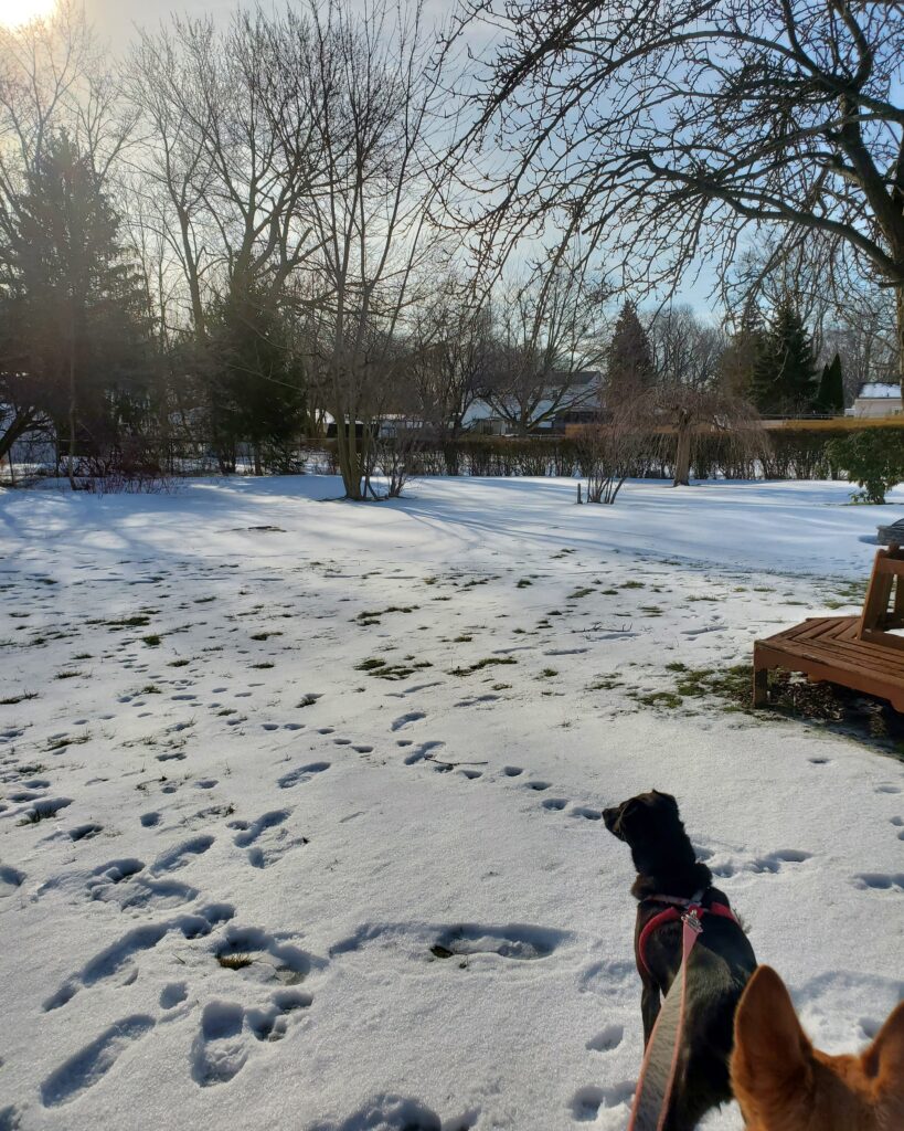 Before Mom could buy a house we rented one from Mom’s real estate agent, Joe. We lived in his house in a placed with a complicated-sounding name, Irondequoit. Well, it had a HUGE backyard – even bigger than in Phoenix! And it was all covered in snow when we arrived, and it stayed that way for weeks! We had so much fun galloping around in all that snow. Mom was surprised since, one time when we visited the Grand Canyon in May and there was still a bit of snow, I was scared of it. But that was before Irina came to live with us. Irina told me she’d lived in snow in Northern Arizona and it was super fun. There were all kinds of scents and treats to be uncovered! And she was right!