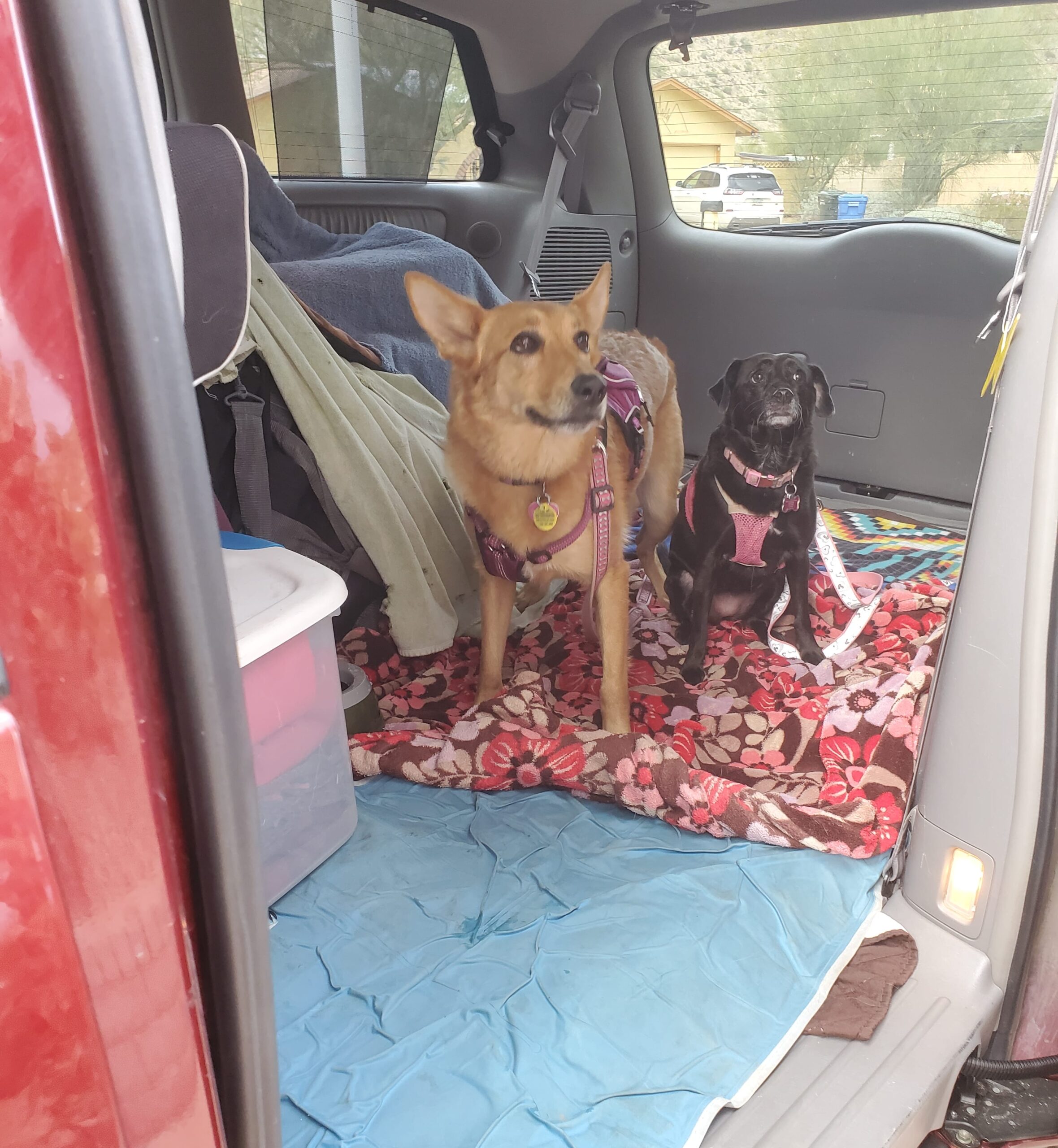 Mom knew I was depressed over Rhea, so she decided to bring a new companion into the house. She didn’t want another cat because it took me so long to learn to get on with Rhea and Katusha. So, she went to the shelter she volunteered at to adopt this little brown and white chiweenie whom she said looked just like me. But that dog, Lucy, was adopted right before we got there. So, the adoption specialists said since I was there to meet a new friend, Mom should have me try out some other dogs. So, I waited in a big play area while they brought several dogs by to play with me. One of them was a crazy jumper and Mom worried he would jump the fence in no time, one was way too high-strung and wouldn’t stop barking and then whining, and one actually had the nerve to growl at me when I made a stink about him warming up to Mom too quickly. We were about to go home empty-handed when they brought this big coyote-looking dog in, who’d just arrived at the shelter from rural northern Arizona. She looked scary but seemed pretty cool. She sniffed at me, but didn’t get too crazy, and when she sniffed at Mom and I made it known she was mine, this dog just acted like no biggie, little dude, and trotted away to run about the field. The adoption lady said, hmmm, they’re tolerating each other anyway. Since coyote lady had not reaction to the cats in the cattery, we decided to do a slumber party.