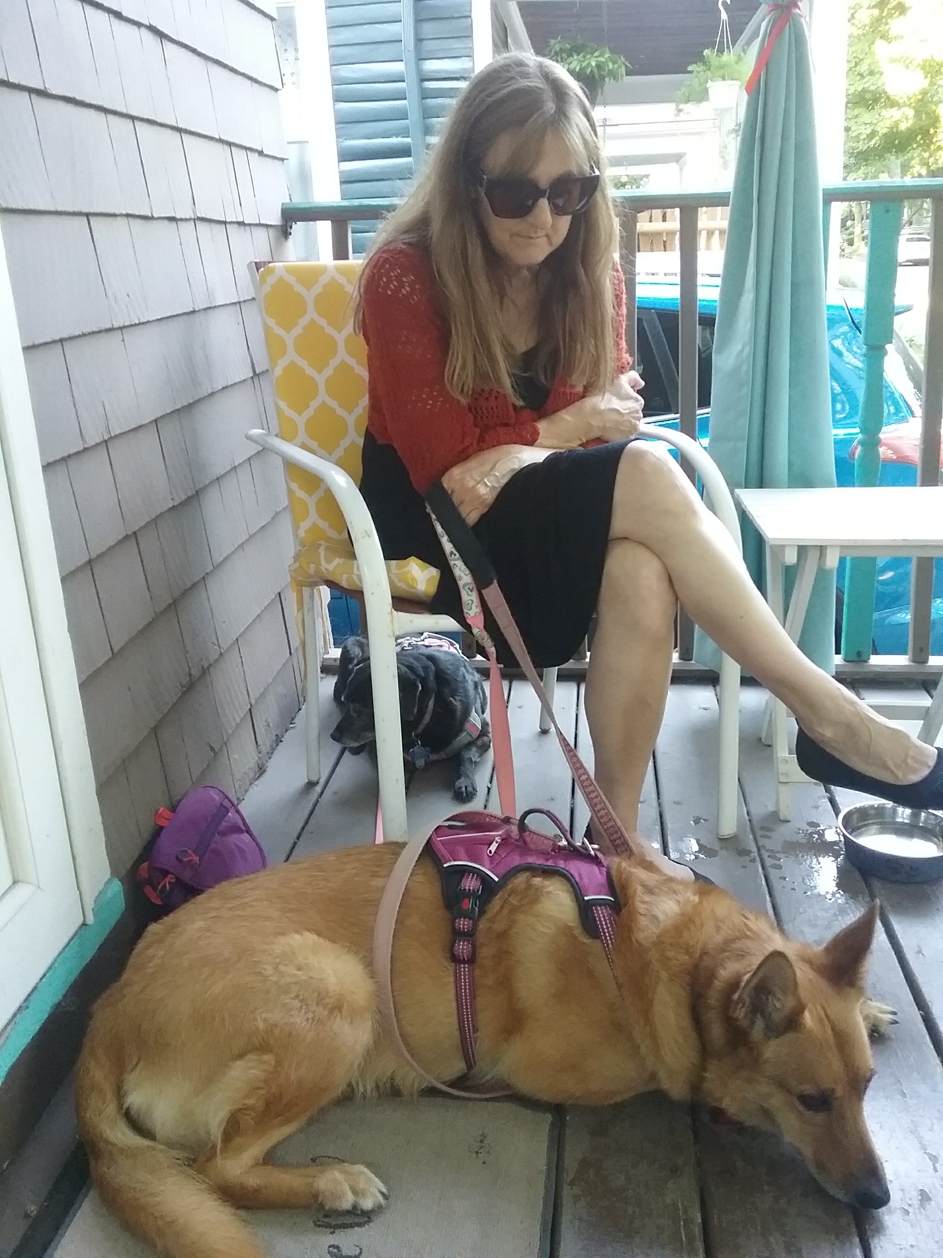 It’s very very different. But home nonetheless! It’s colder for sure. And Mom’s and my joints are a little achy in winter. But snow is, as I said, super fun, and summer is nice and warm and we spend a lot time sitting on the back patio or on the porch when it’s warm out. We have lots of nice neighbors who say hi to us. Grandma took this pic of us with Mom on the porch. Mom travels a lot now to faraway places like Africa and Alaska to take photos of big animals. When she does, Grandma comes to stay with us. It’s great when she stays because she gives us lots of treats!